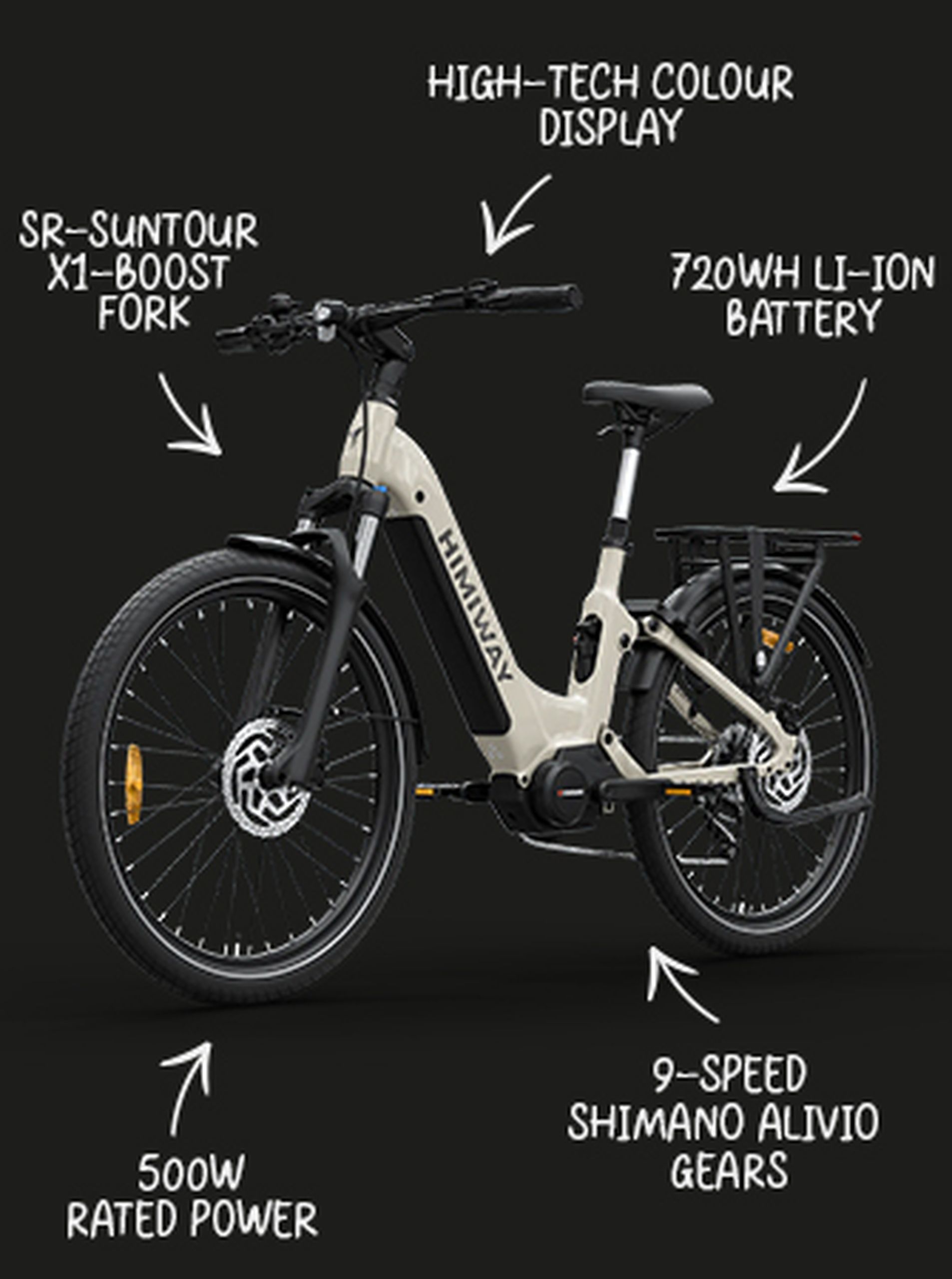 Rower ma czystą konstrukcję z niską ramą typu step-through, która ułatwia wsiadanie i zsiadanie. Rama zakrzywia się w dół zamiast tradycyjnej górnej rury, dzięki czemu użytkownicy nie musi przechylać nogi nad siodełkiem. Rower jest wyposażony w tylny bagażnik idealny do przewożenia toreb i ma w pełni zakryte błotniki, które zapobiegają rozpryskiwaniu się wody i błota na kierowca. Himiway A7 Pro jest dostępny w kolorze białym i czarnym, beżowym, ciemnopomarańczowym, zielonym i szmaragdowozielonym. Czy chciałbyś mieć rower, który robi wszystko? Himiway A7 Pro jest idealny, jeśli chcesz mieć rower elektryczny, który jest gotowy na wszystko, bez konieczności późniejszego dodawania dodatkowych części